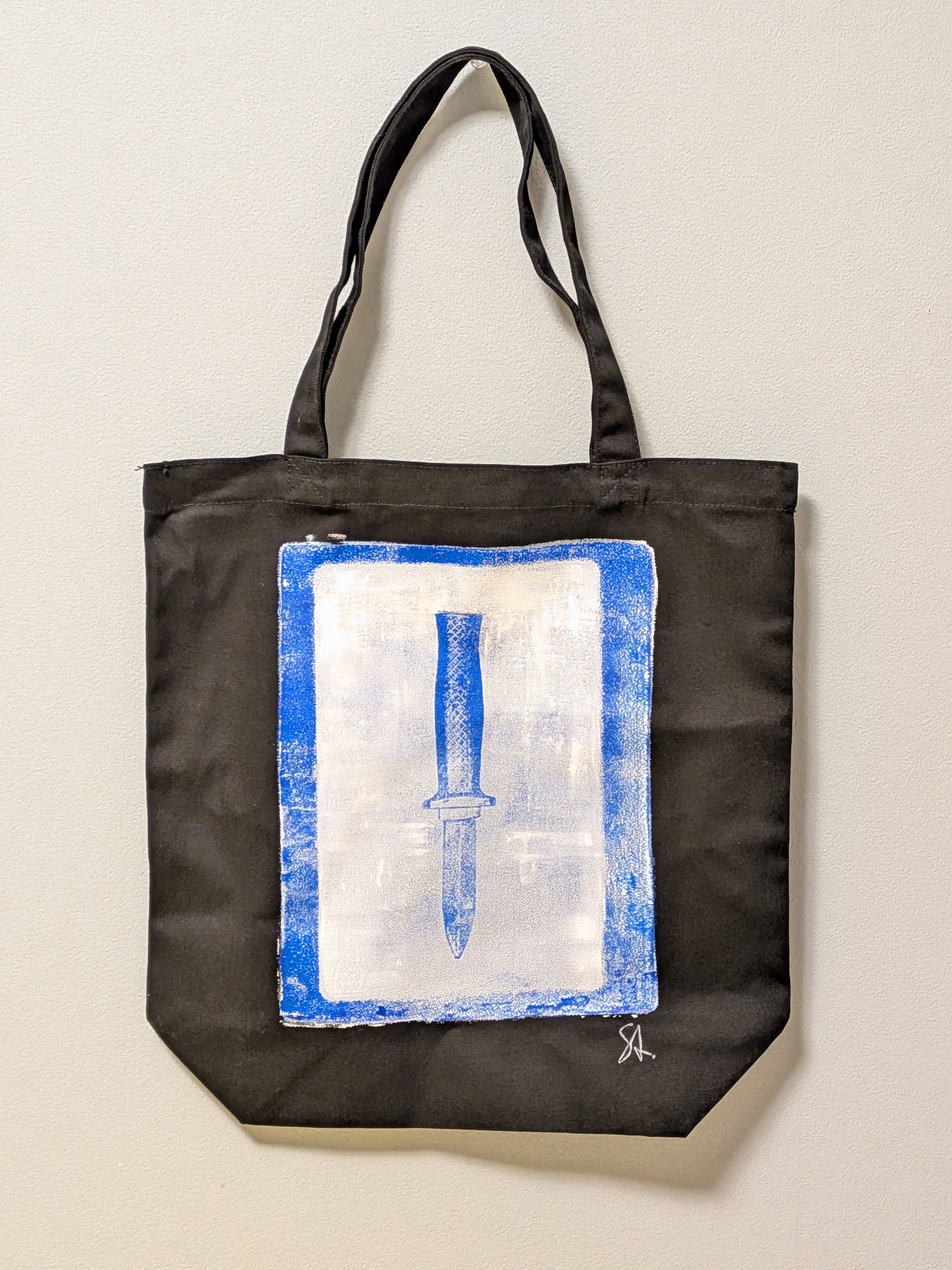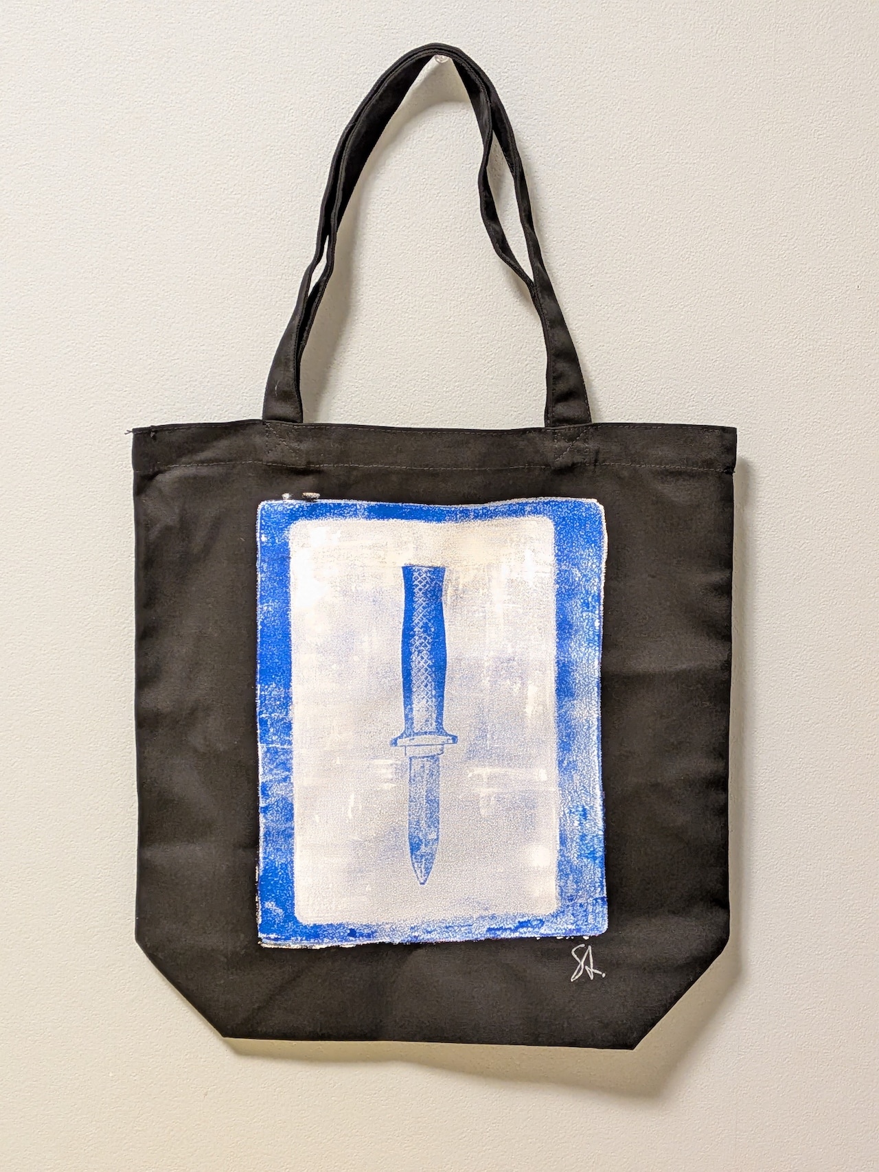 A4サイズのトートバッグに、ナイフ作品をモノタイプ版画にて印刷。1点ものの手刷りのトートバッグです。