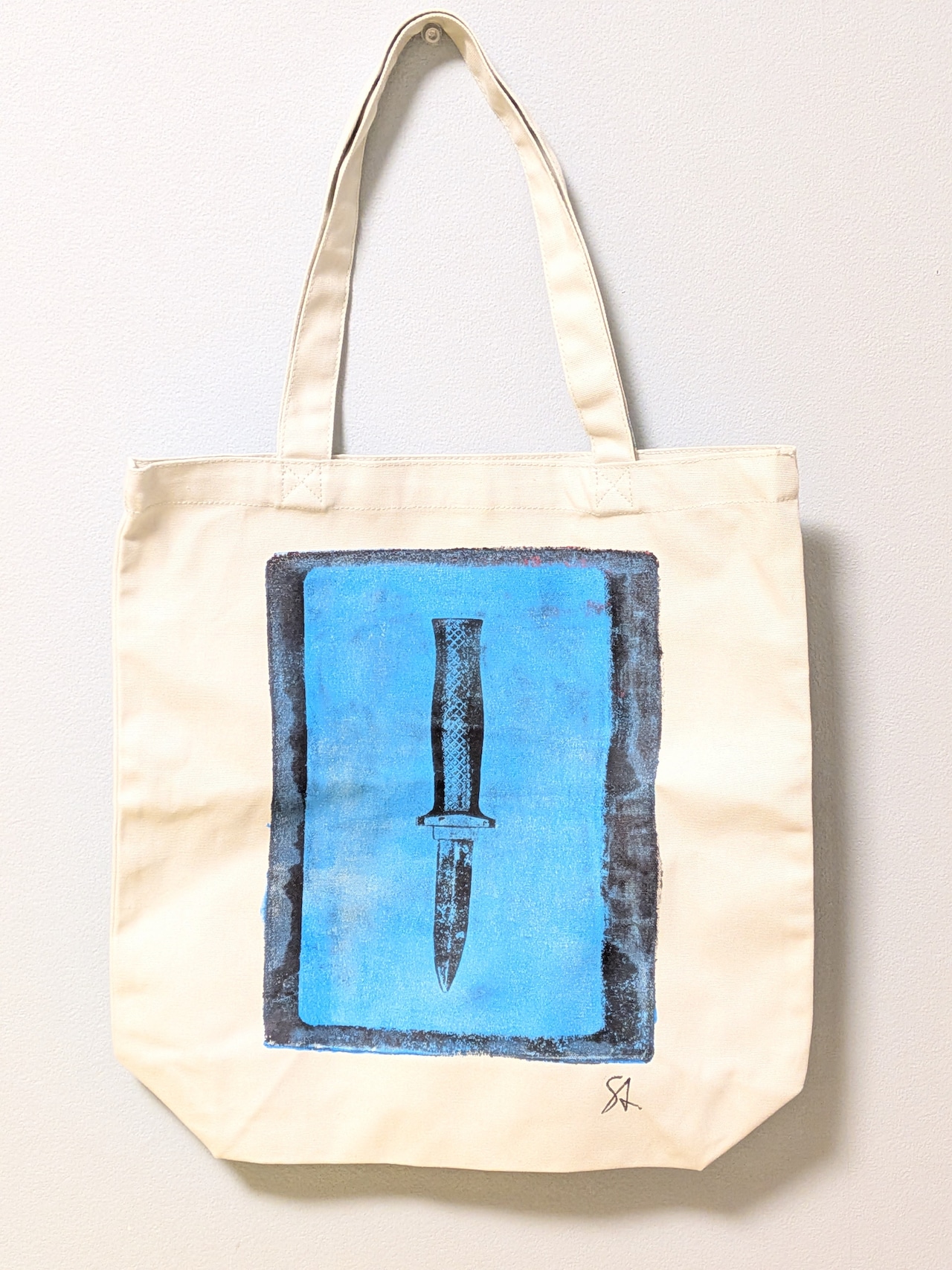 A4サイズのトートバッグに、ナイフ作品をモノタイプ版画にて印刷。1点ものの手刷りのトートバッグです。